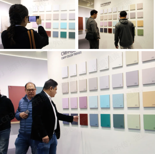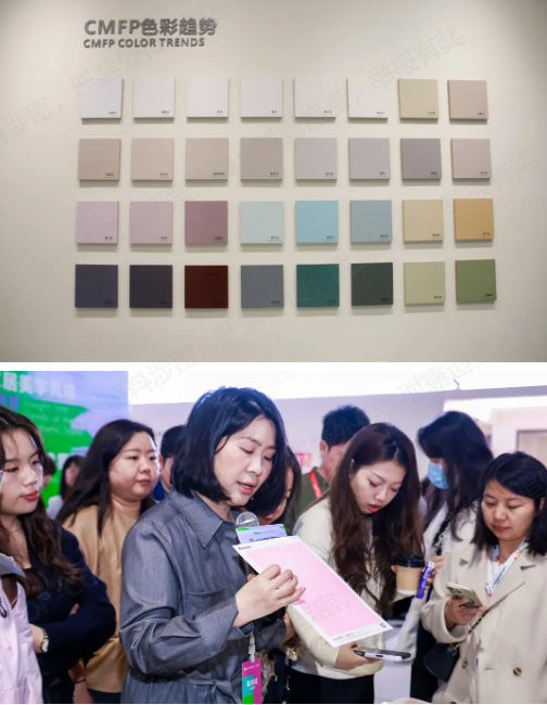 圍繞“色彩”和“紋(wén)理”兩(liǎng)大核心方向,麻豆精品视频CMFP創意(yì)設計團隊結合飾麵材料的材質和工藝,推出板材塗飾材料的色彩(cǎi)趨勢(shì),打(dǎ)造中性、複古為主的整麵色彩牆,吸引不少觀眾駐足(zú)觀看。